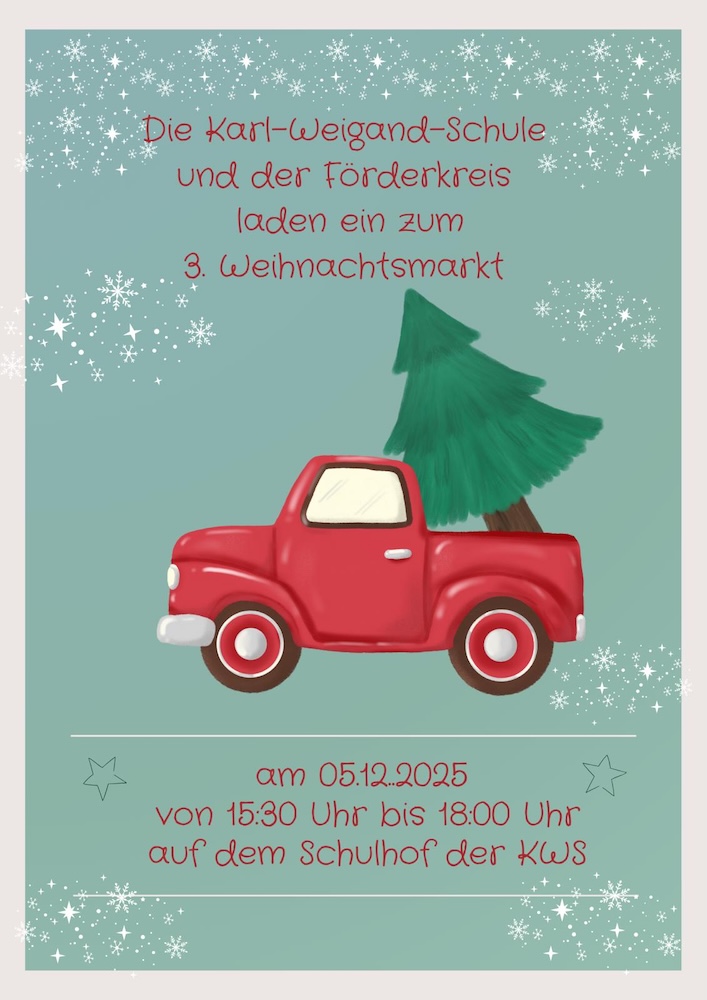 Am 05. Dezember 2025 laden die Karl-Weigand-Schule und der Förderkreis herzlich zum 3. Weihnachtsmarkt auf dem Schulhof ein. Von 15:30 Uhr bis 18:00 Uhr erwartet unsere Gäste eine gemütliche vorweihnachtliche Atmosphäre mit liebevoll gestalteten Ständen, kleinen Aufführungen und verschiedenen Bastel- und Mitmachangeboten.