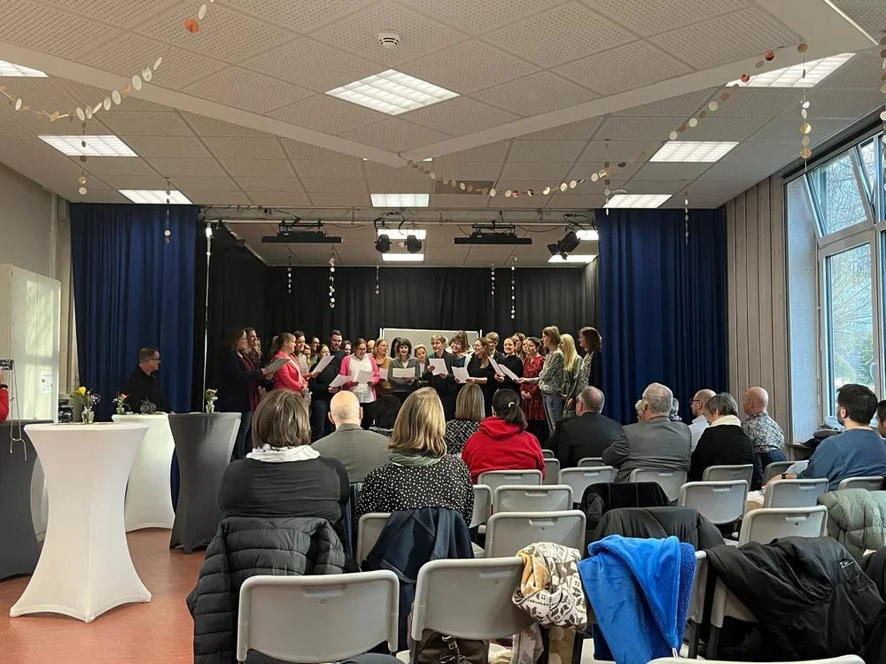 Die Mitglieder des Schulleitungsteams, Frau Hammann und Frau Struwe, stellten ihren Dank und die guten Wünsche für die scheidende Chemie- und Mathelehrerin in einer Reaktionsgleichung dar. Das Ende der Veranstaltung bildete der Chor des Kollegiums, der sich mit einem irischen Reisesegen von Frau Burkhard verabschiedete.