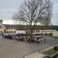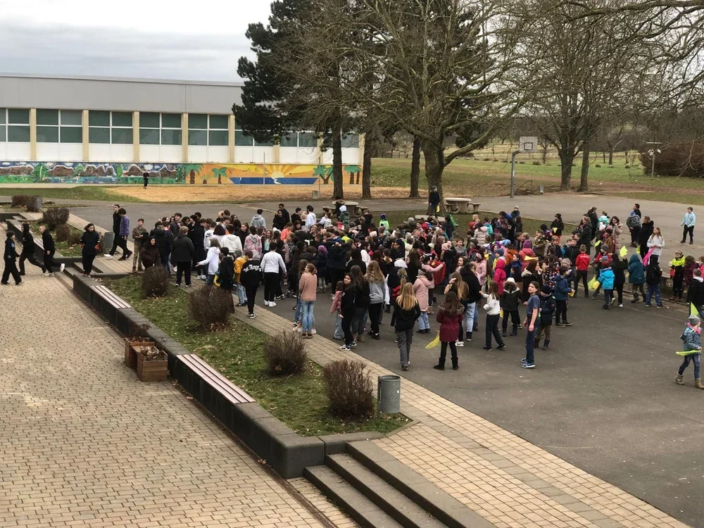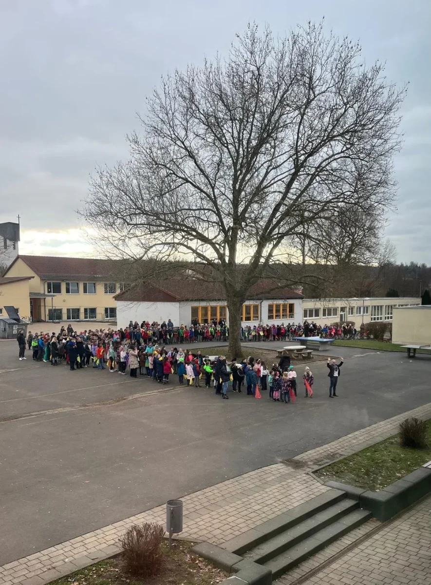 Mit diesen Wünschen verabschiedeten sich am 31. Januar die Schülerinnen und Schüler der KWS von ihrer Schulleiterin Frau Burkhard. Von ihrem Büro im Verwaltungstrakt bis auf den Schulhof bildeten die Kinder der Grundschule am späten Vormittag ihres letzten Schultages ein Spalier, durch das Frau Burkhard geleitet wurde. Mit bunten Tüchern winkten die Kinder zum Abschied. Auf dem Hof angekommen, richtete sich der Blick auf das Sekundarstufengebäude, aus dessen frisch renovierten Fenstern Schülerinnen und Schüler winkten und Schilder mit einzelnen Buchstaben hochhielten. Zu lesen war: