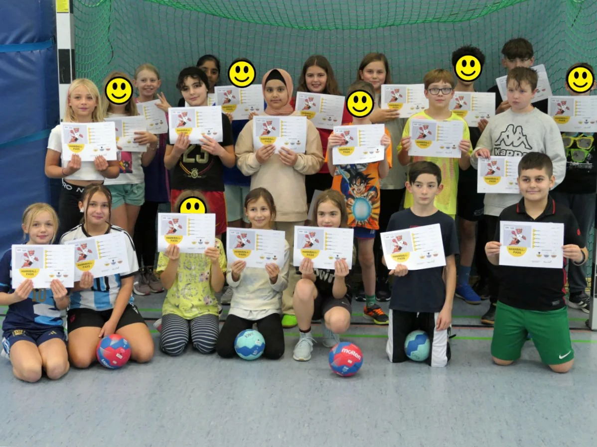 Im Rahmen des Sportunterrichtes absolvierten die Schülerinnen und Schüler der Klasse 5b (Sportklasse der Karl-Weigand-Schule) das offizielle DHB-Handball-Spielabzeichen. Der Hanniball-Pass besteht aus fünf Übungen, die die koordinativen, technischen und athletischen Fertigkeiten der Kinder prüfen und gleichzeitig schulen. Dabei mussten die Schülerinnen und Schüler verschiedene Aufgaben aus den Bereichen Koordination, Schnelligkeit, Werfen und Fangen, Zielwerfen sowie Prellen bewältigen. Hierbei konnte je nach Punktzahl das Handball-Spielabzeichen in Bronze, Silber oder Gold erworben werden. Mit viel Engagement, Begeisterung und sportlichem Einsatz versuchten die Schülerinnen und Schüler möglichst viele Punkte zu sammeln. Alle Schülerinnen und Schüler der Sportklasse erreichten das Spielabzeichen und wurden sowohl mit dem Handball-Pass als auch mit einer Urkunde geehrt. Wir gratulieren allen Schülerinnen und Schülern der Sportklasse 5b zu diesem Erfolg!
